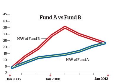 |  | One of the simplest ways is to look at the historical analysis of returns. For this, one can either consider point-to-point returns or rolling returns. Let’s look at what these terms mean, and which one is a better measuring tool. Point to point returns: These returns are calculated by considering the NAVs at two points in time-entry date and exit date. Suppose you invested in the growth option of a mutual fund scheme in January 2005 at a NAV of 12. Now, if the NAV were to rise to 32 on the exit day, say, January 2012, using point-to-point returns you’ll find that your fund has generated an absolute return of 166.67%. |
