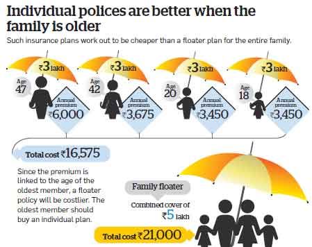 | Floaters work best in case of young families. The premium is low because it is linked to the age of the eldest member in the plan. "A family floater cover is advisable when the oldest member is less than 45 years old," says Neeraj Basur, chief financial officer, Max Bupa Health Insurance.For 34-year-old Rakesh Somani, it is an ideal choice for insuring his family (see picture). "Since we are a young family and our healthcare costs are not too high, a floater plan of Rs 5 lakh should be sufficient for us," he says. Costly for older families However, the same may not be true for an older family, where the eldest member is more than 45 years old and the children are grown up. In such a case, individual policies may work out to be cheaper. The same is true if you want to insure an elderly member of the family. The premium can be prohibitive when you include a senior citizen (above 60) in the floater plan.
